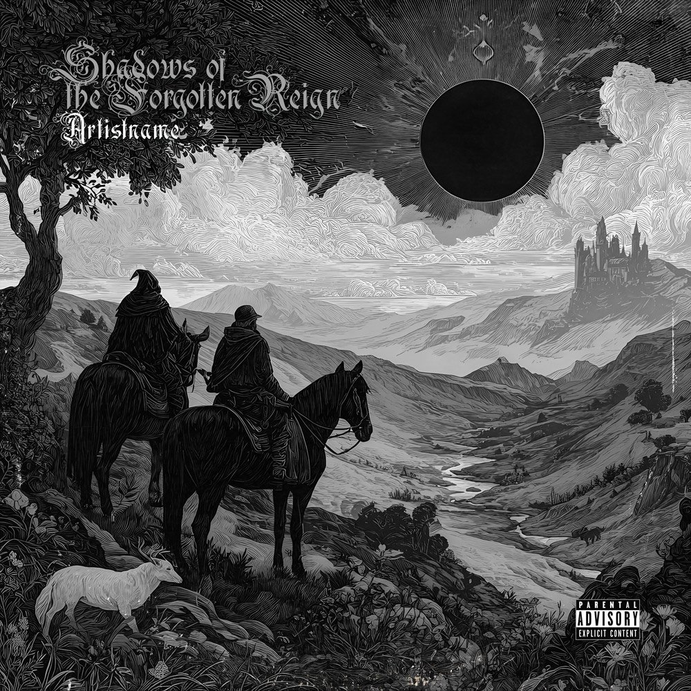 The visual narrative inside Shadows of the Forgotten Reign art suggests a journey at the end of an era. A black eclipse dominates the sky, symbolizing collapse, rebirth, or forbidden power. The riders feel like guardians, exiles, or witnesses to history. This ambiguity allows Shadows of the Forgotten Reign dark fantasy album cover art to adapt to many creative stories, concepts, and interpretations across different media and artistic fields.