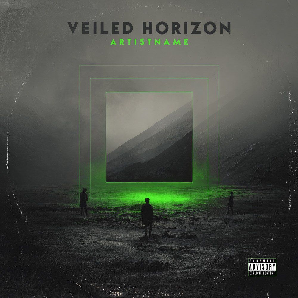 The digital artistry displayed in Veiled Horizon Dark Ambient Electronic Music Album Cover Art involves complex layering and manipulation of photographic and graphic elements, resulting in a polished, professional-grade finish. The inclusion of the parental advisory logo placeholder adds to the sense of a finished, ready-to-publish cover, perfect for the Hip Hop or Rock genres if the green light is interpreted as a more aggressive or urban element.